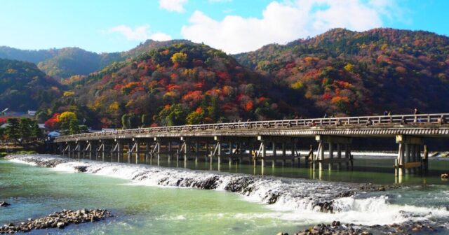 京都・嵐山は秋になると山々が赤や黄色に染まり、渡月橋から眺める景色が格別です。